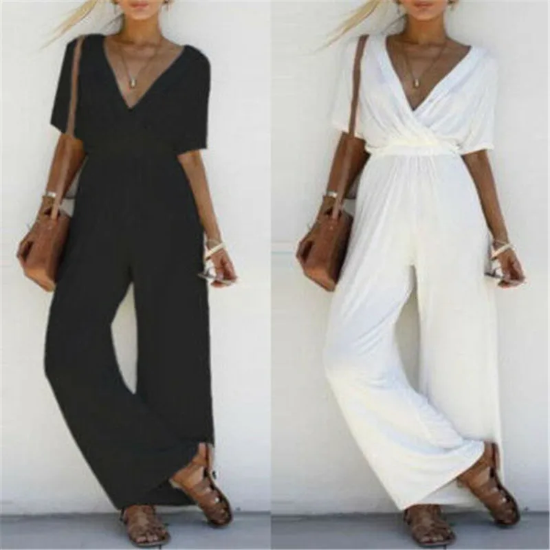 Новейший Женский Повседневный Комбинезон, сексуальные длинные брюки с v-образным вырезом, офисные женские комбинезоны, белый, черный, розов...