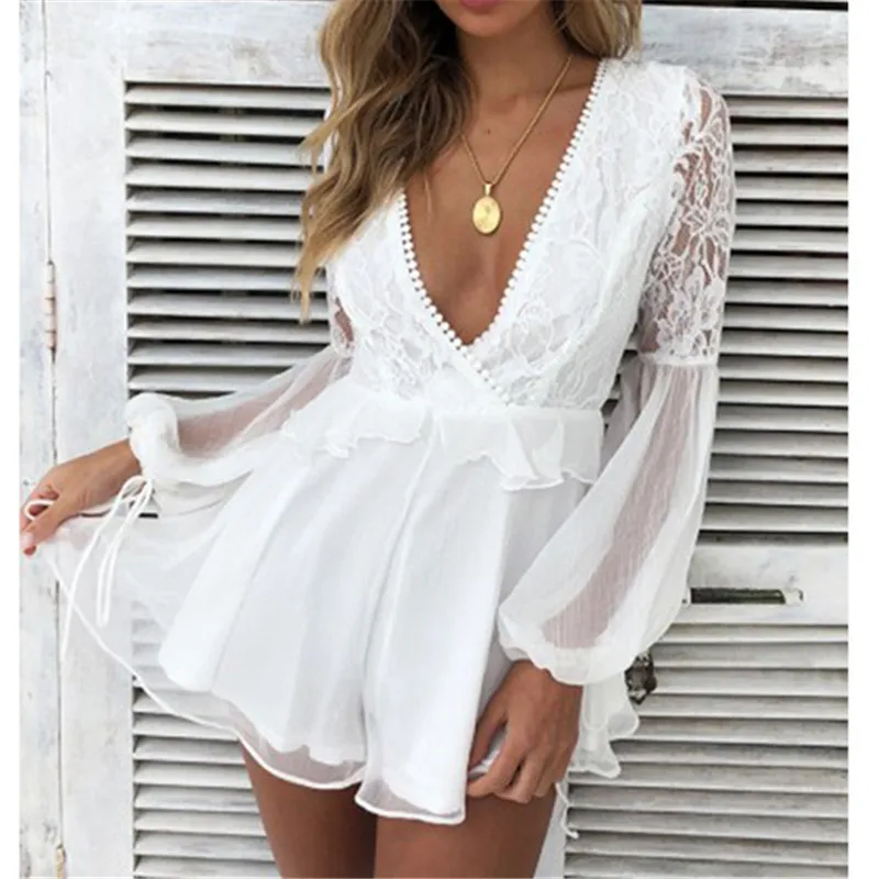 Женский сексуальный комбинезон с v-образным вырезом открытая спина кружево лоскутное фонарь длинный рукав комбинезон 2019 летние белые повсе...