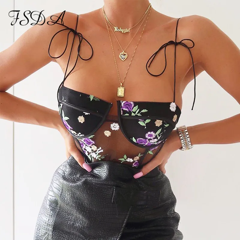 Женский кружевной боди на тонких бретельках FSDA, черный прозрачный топ с вышивкой и открытой спиной 2020
