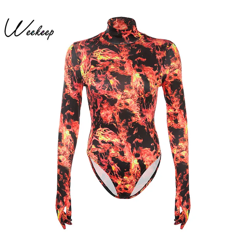 Weekeep, Женское боди с длинным рукавом, с принтом пламени, водолазка, с перчатками, бодикон, боди, Mujer, вечерние, Клубная одежда, боди
