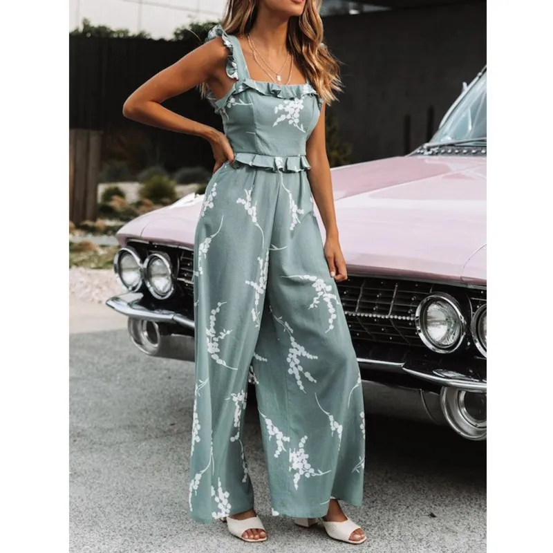 Для женщин сезон: весна–лето ремни Ruffled печати Повседневное Ромпер Для слинга 2019 Лето спинки свободный спортивный костюм T2