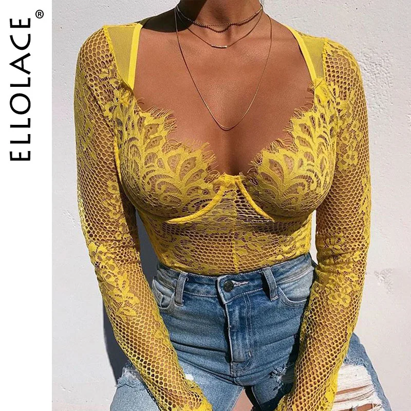 Ellolace сексуальный кружевной боди Женский глубокий v-образный вырез с длинным рукавом комбинезон облегающий боди Летний комбинезон женский с...