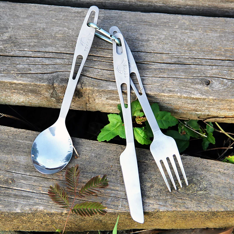 TOAKS 3 в 1 Титановая Ложка вилка, нож, столовые приборы Наборы с карабином для пикника, барбекю, кемпинга, столовые приборы, походная Посуда Spork ...