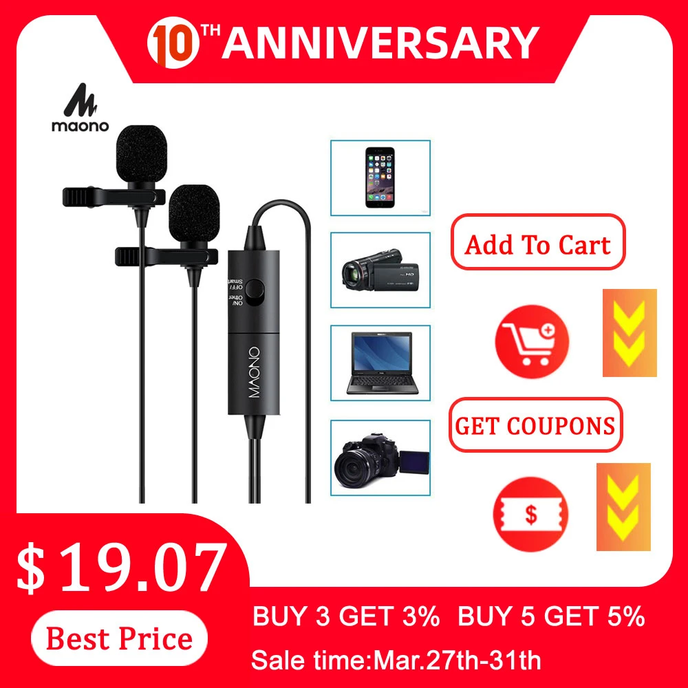 MAONO AU-200 Dual Lavalier Microphone HandsFree Clip-on Lapel Microphone Collar Condenser Mic for Camera DSLR Phone PC Laptop