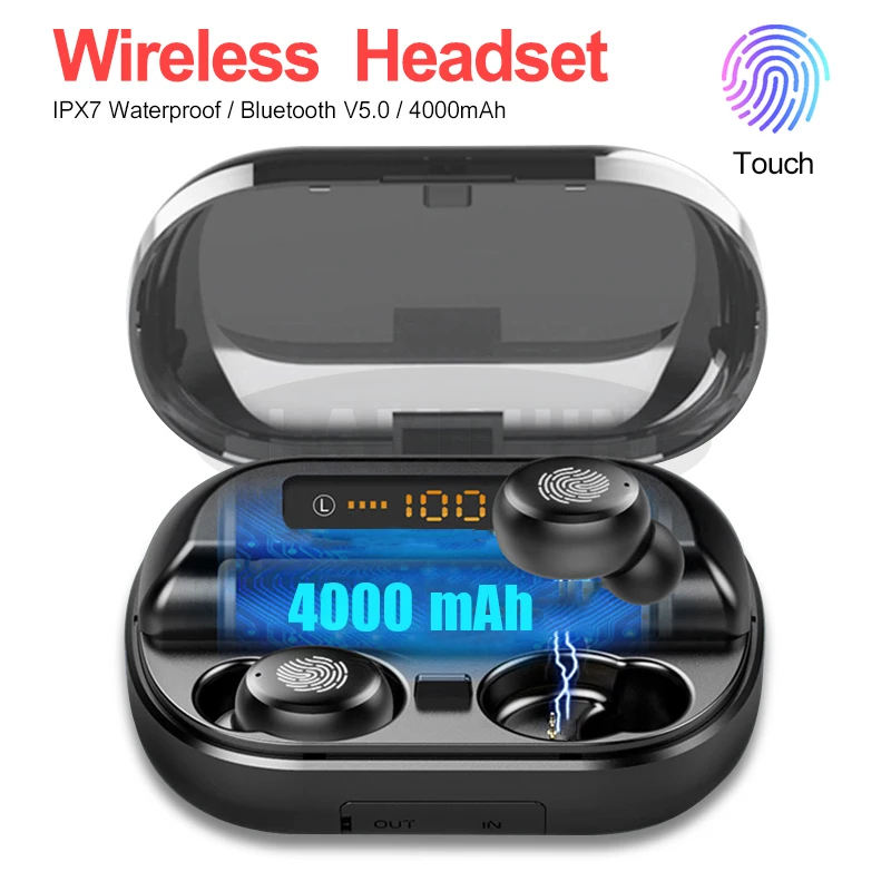 Беспроводные наушники с Bluetooth 5,0, IPX7, водонепроницаемые, 9D, стерео, спортивные наушники с 4000 мАч, внешний аккумулятор, TWS, Bluetooth наушники