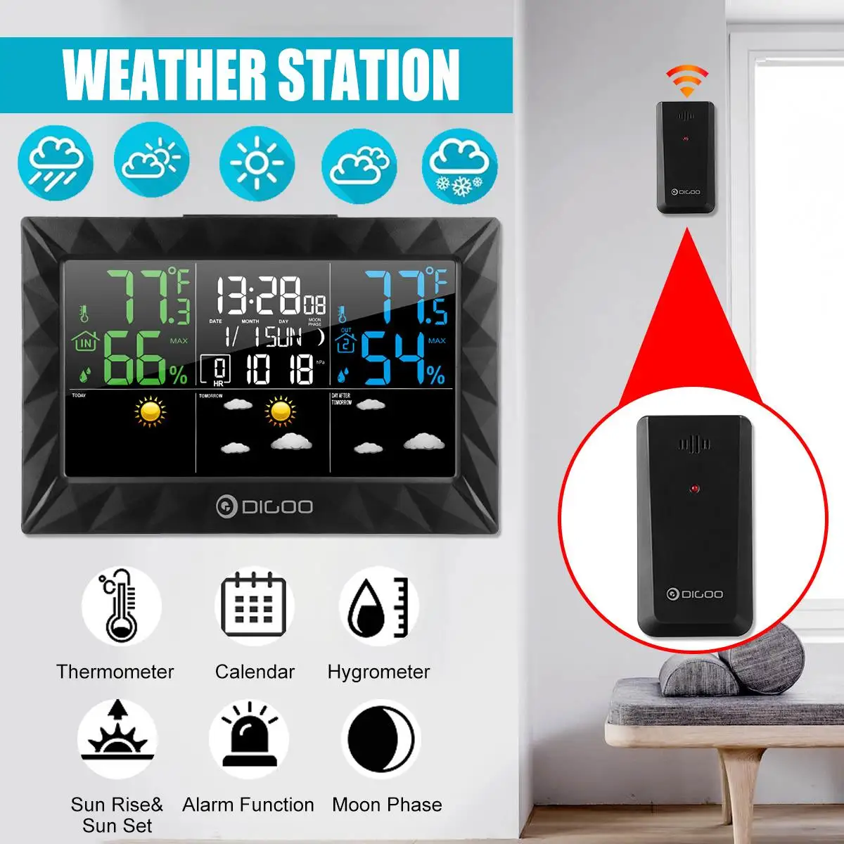 DIGOO DG-8270A, домашняя, уличная Метеостанция + 100 м, датчик погоды, термометр, гигрометр, метр, календарь, 3CH, подсветка, черный