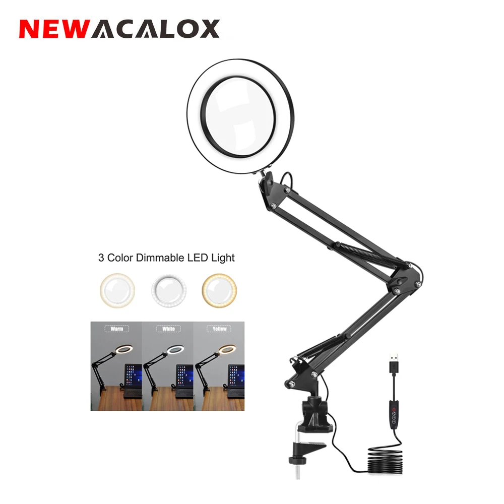 NEWACALOX 5X светящаяся лупа USB 3 вида цветов LED увеличительное стекло для ремонта паяльника/настольная лампа/косметический инструмент для ухода за кожей