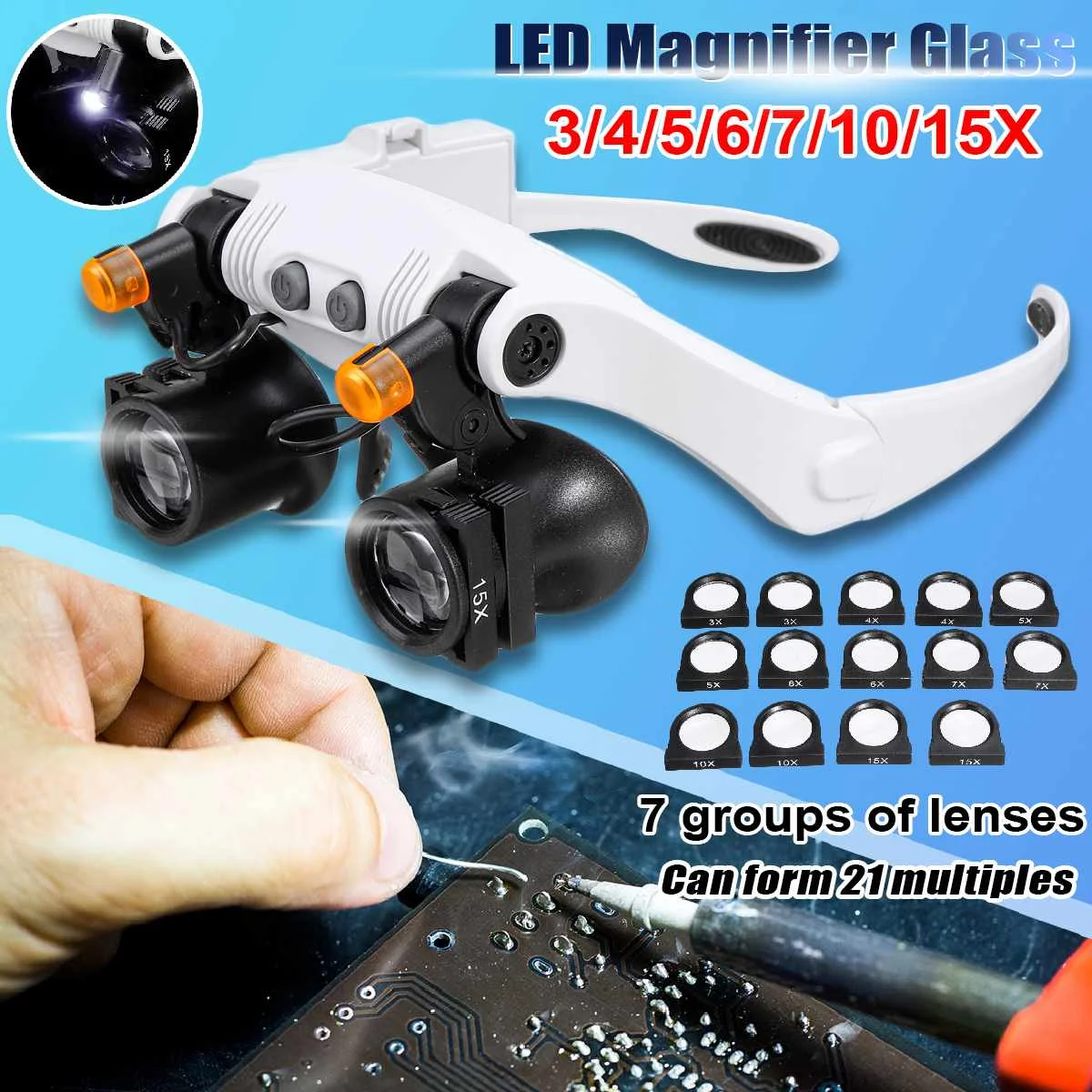 3/4/5/6/7/10/15X Стекло es Лупа Стекло 6 объектив лупа очки лупа со светодиодной лампой головная повязка Led увеличительное стекло