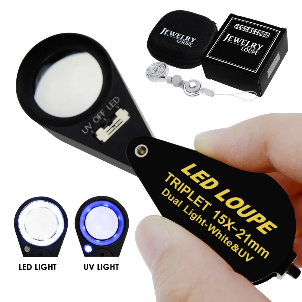 15x21 мм оптическое стекло Лупа 6 светодиодный и УФ свет ювелир складные триплетная линза черный рамки фотограф Hobbyist Часовщик