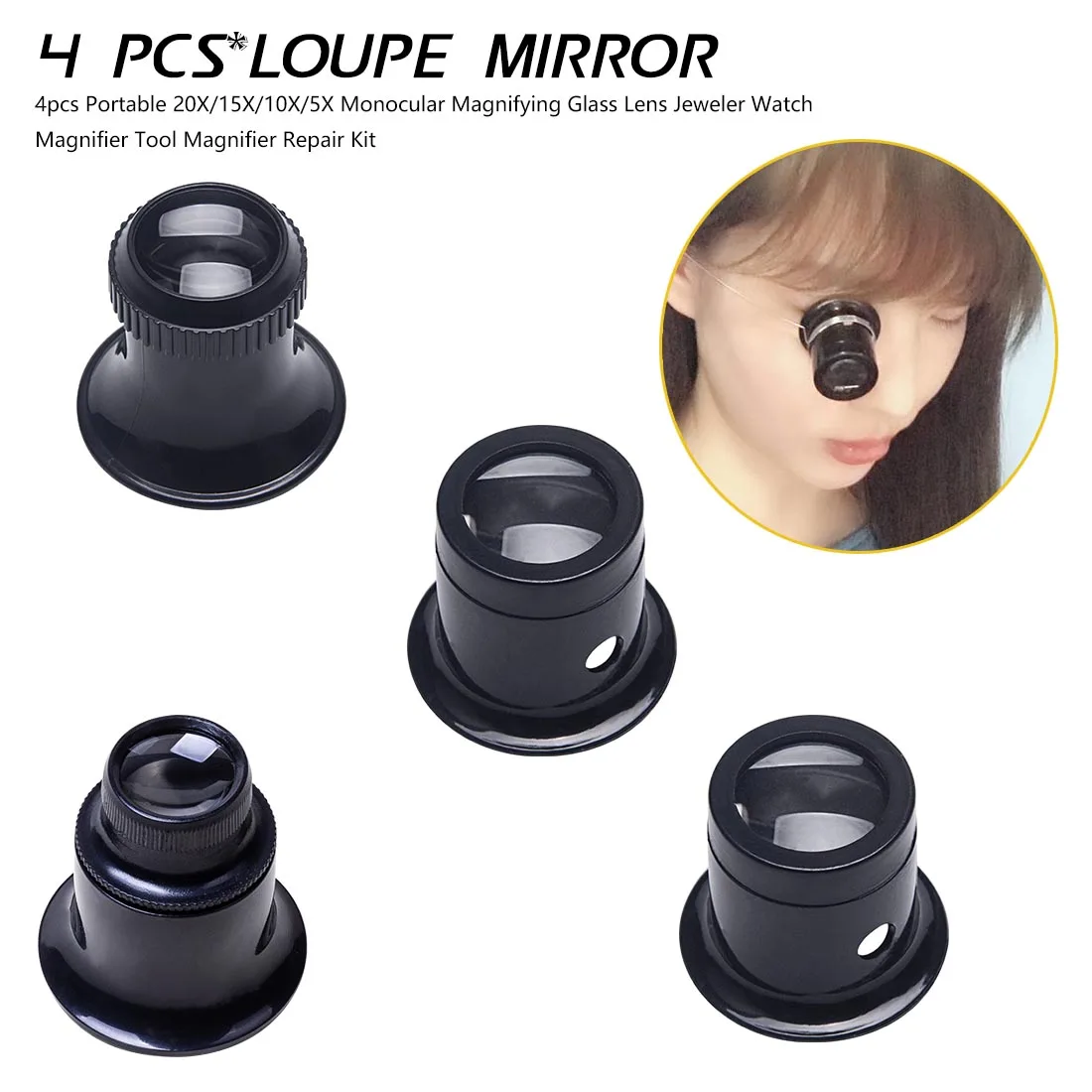 4 шт. портативный 20X/15X/10X/5X Монокуляр, увеличительное стекло объектив ювелирный часы приспособление с лупой Лупа ремонтный комплект
