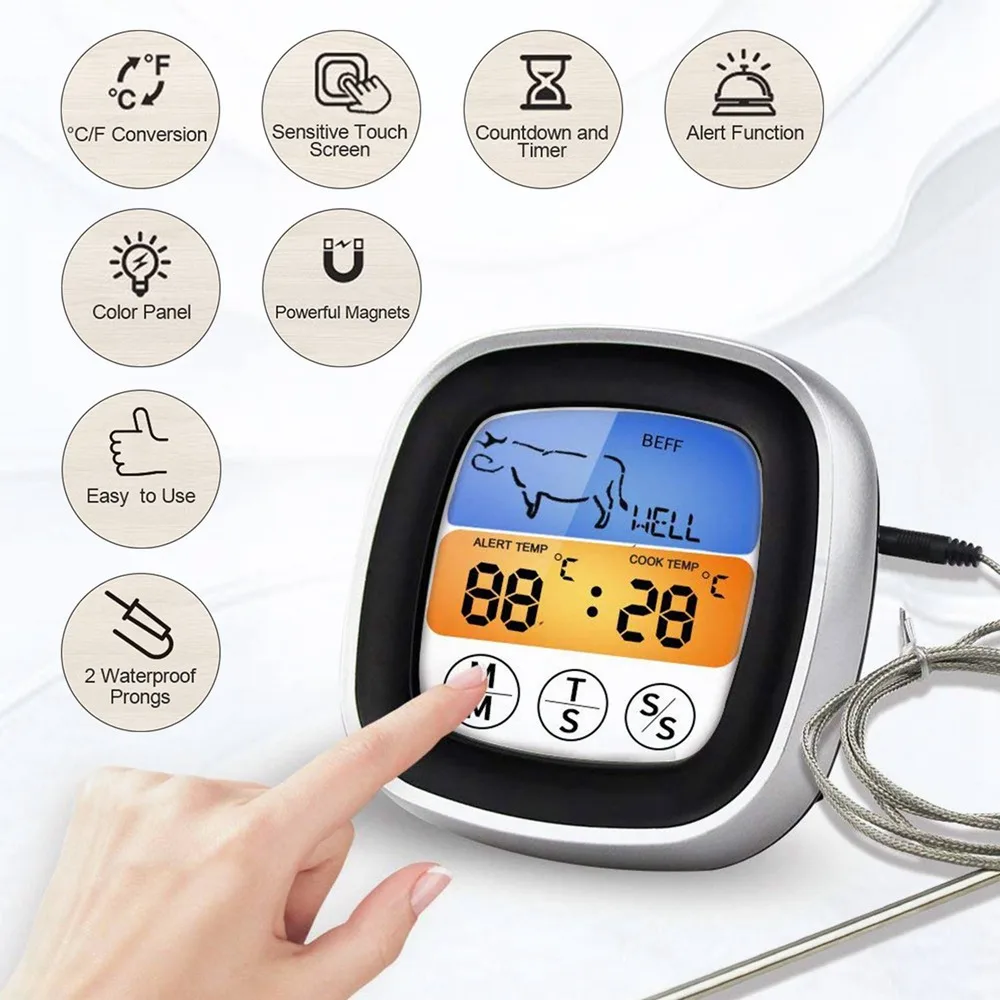 Цифровой Кухня термометр сенсорный барбекю, печь мясо Температура метр таймер обратного отсчета с оповещения Функция