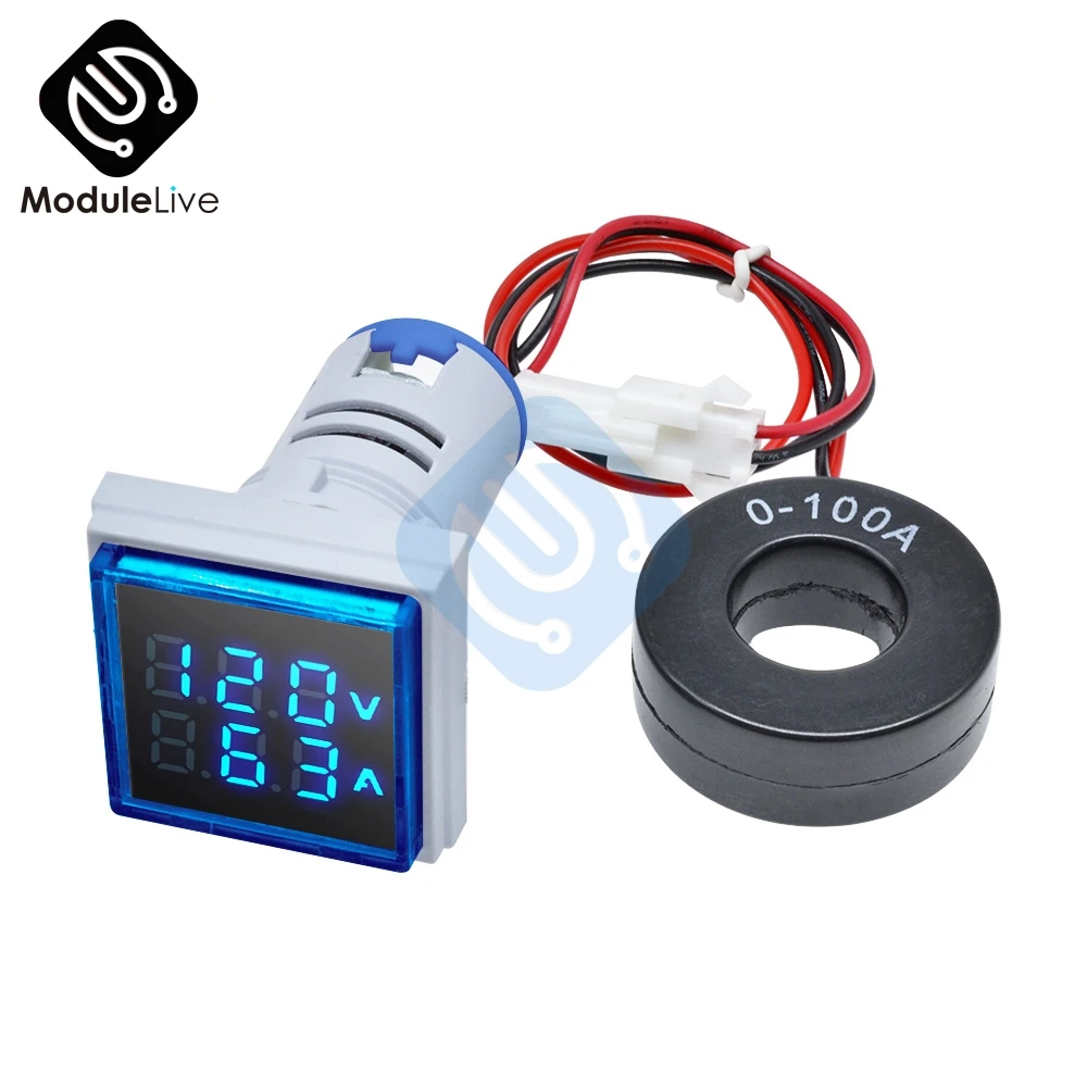 22 мм 0-100A AC 50-500 в 20-75 Гц цифровой вольтметр Амперметр Напряжение измеритель тока детектор синий квадратный тестер 220 В инструменты