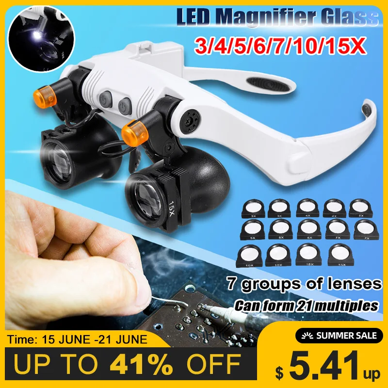 Профессиональный 3X 4X 5X 6X 7X 10X 15X Регулируемый 7 объектив лупа светодиодный светильник головная повязка Лупа стекло светодиодный увеличитель...