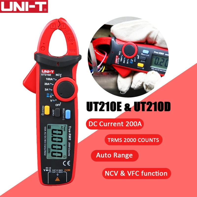 UNI-T UT210E/UT210D Мини цифровой токовые клещи; True RMS100A-200A амперметр, V. F. C./NCV/температура тесты, ЖК дисплей подсветка