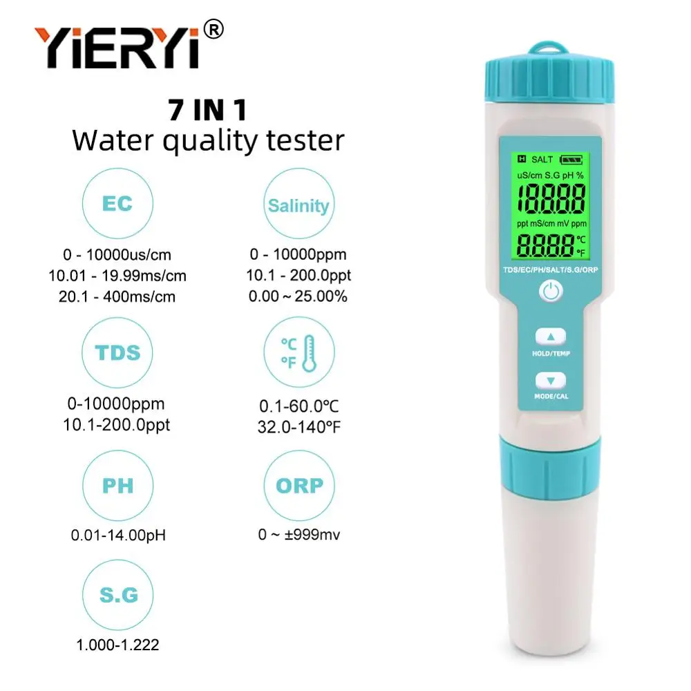 Yieryi 7 в 1 соленость/PH/TDS/EC/ORP/SG/TEMP Измеритель Качества Воды Тестер IP67 Ручка Тип для еды, сельского хозяйства, рыбного пруда, супа