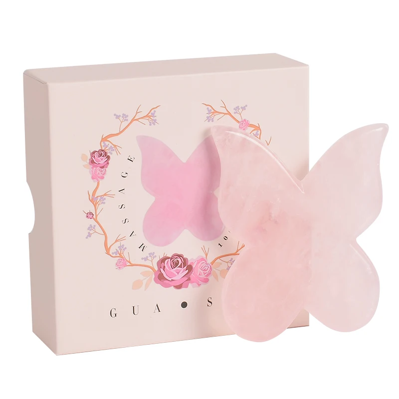 Натуральный розовый кварцовый бабочка Gua Sha + Подарочная коробка, скребок для иглоукалывания, массажный инструмент для массажа лица, спины и ног