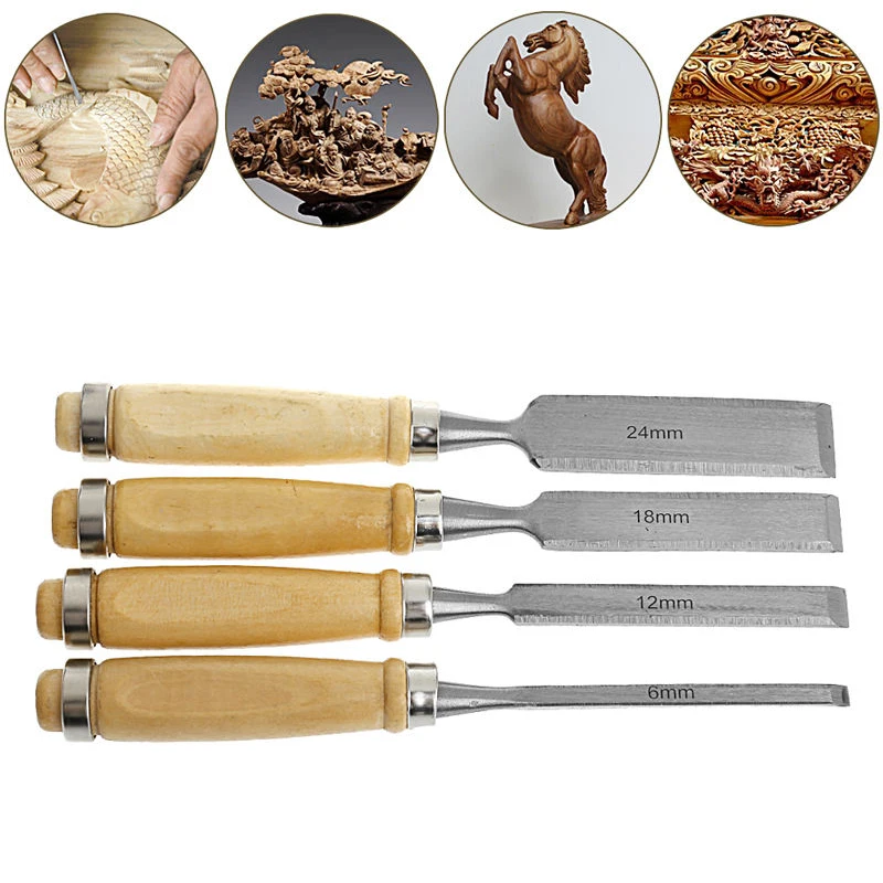 DWZ 4 шт 6/12/18/24 мм Дерево зубило плоское DIY резьба комплект деревообрабатывающий инструмент с рукояткой инструмент