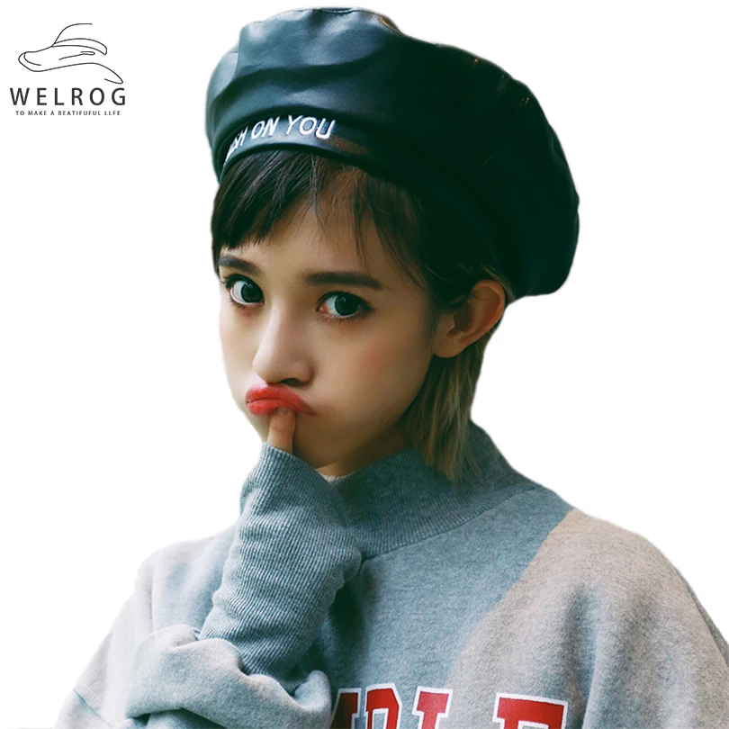 WELROG/повседневные женские береты из искусственной кожи с буквенным принтом, осенне-зимние однотонные женские зимние шапки из искусственной ...