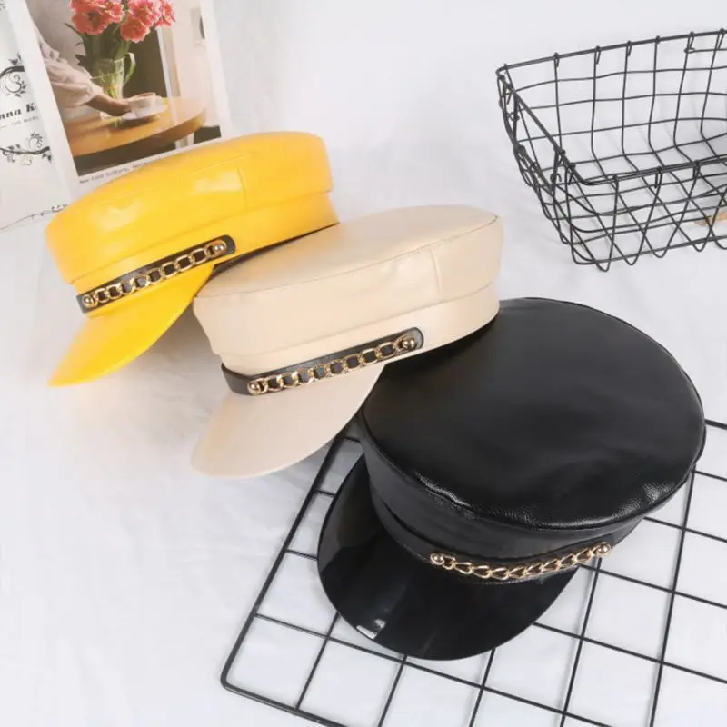 Британский стиль, ретро, искусственный кожаный берет, шапка, блестящая, однотонная, женская, для девочек, газетчик, шапка с козырьком, темно-с...