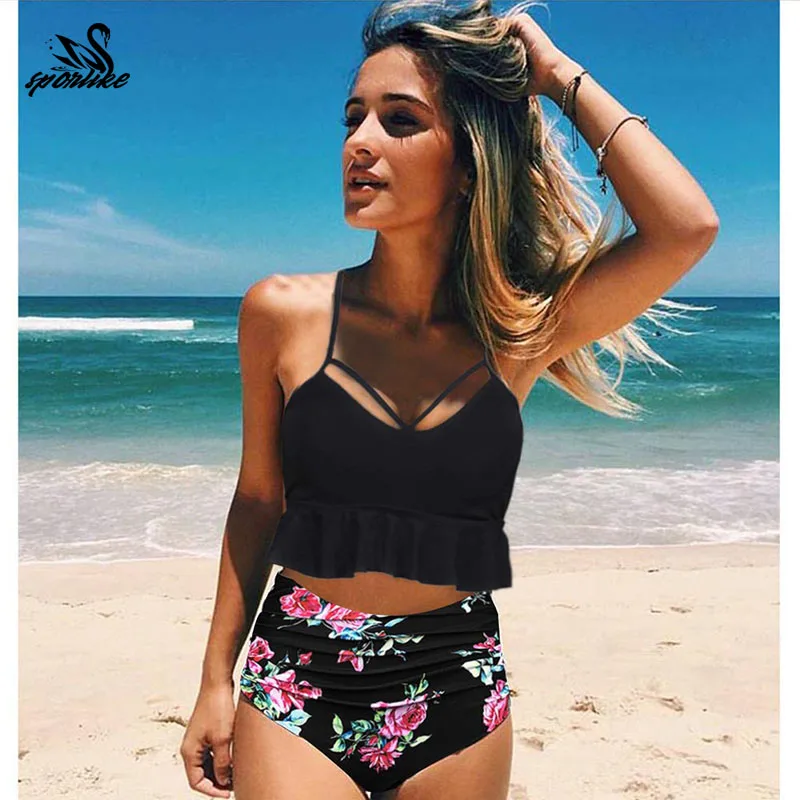 Большие размеры печати бикини пуш-ап высокая талия Купальники Большие размеры Лоскутная купальный костюм Большие размеры купальники с зав...
