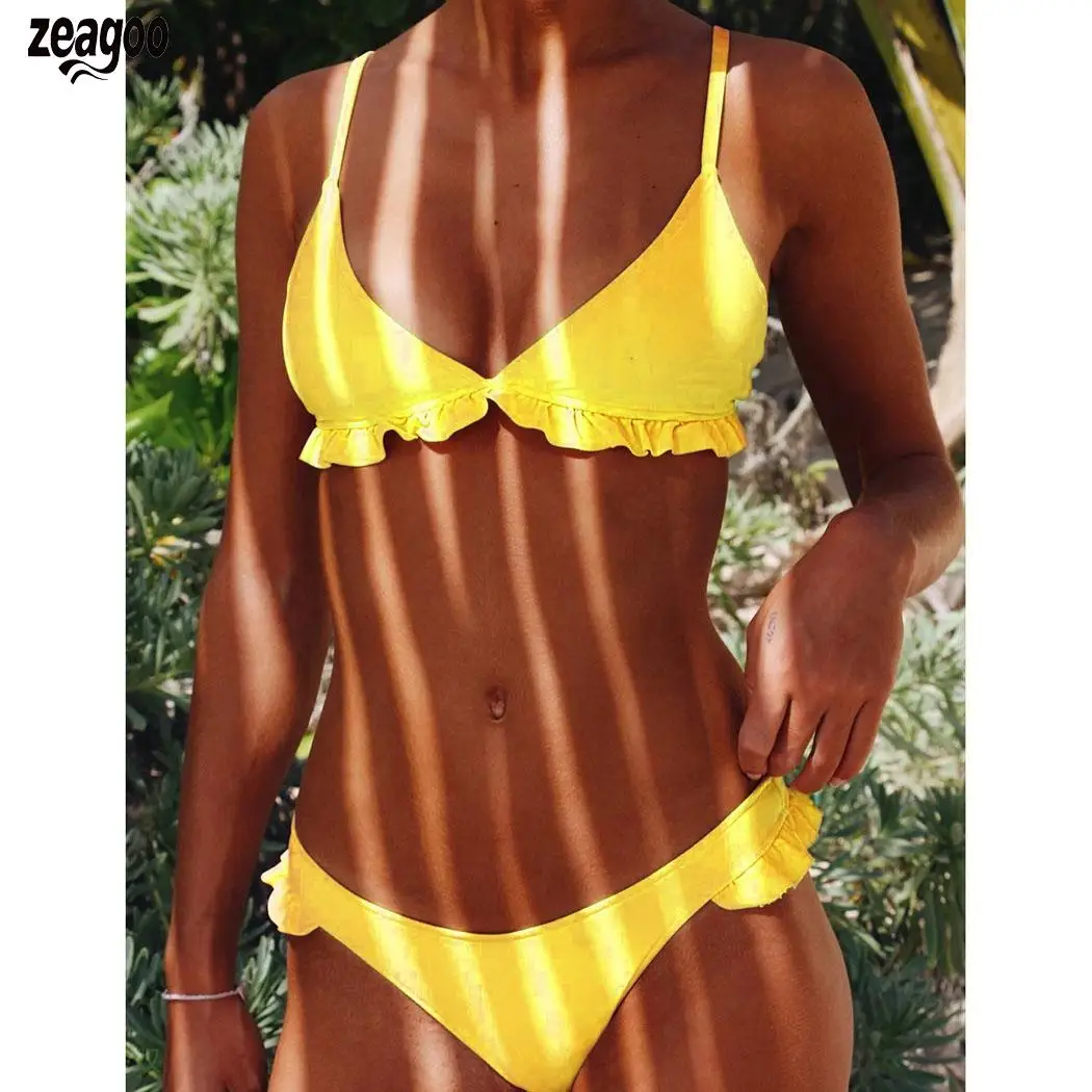 Сексуальный комплект бикини с оборками, Женская однотонная повязка, бразильский купальник, купальник, пляжная одежда, бикини, feminino 2019