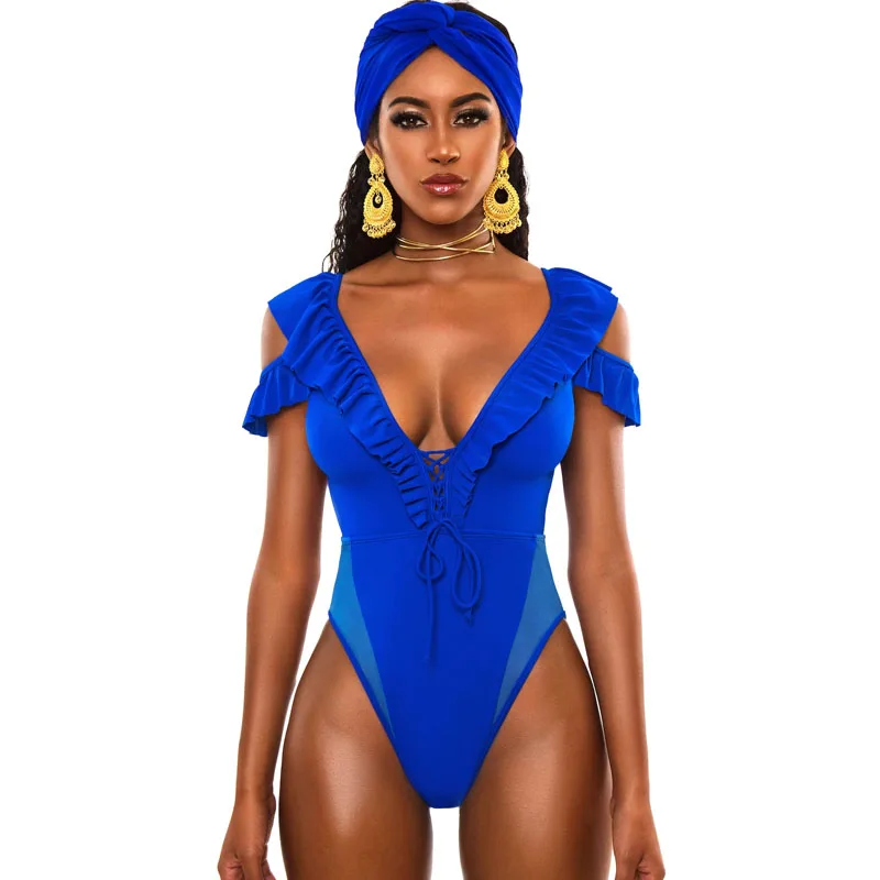 Африканский стиль перспективный сетчатый купальник, купальный костюм, сдельный купальник, синий монокини с оборками, трикини, с глубоким вырезом, на шнуровке, боди