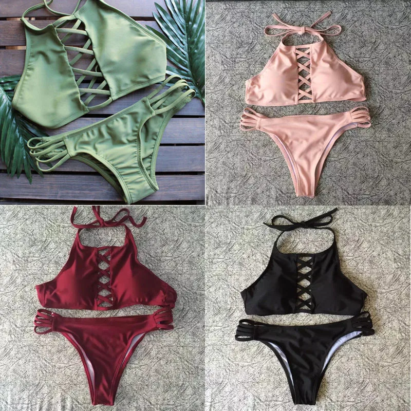 Милый купальный костюм, купальник для женщин, Бандажное бикини, 2017, Одноцветный купальник, сексуальный купальник с бретелькой через шею, ком...