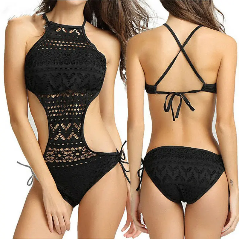 Купальники женские кружевные цельные 2019 летние кружевные открытые с завязками без рукавов сексуальные прозрачные бандажные купальник с вы...