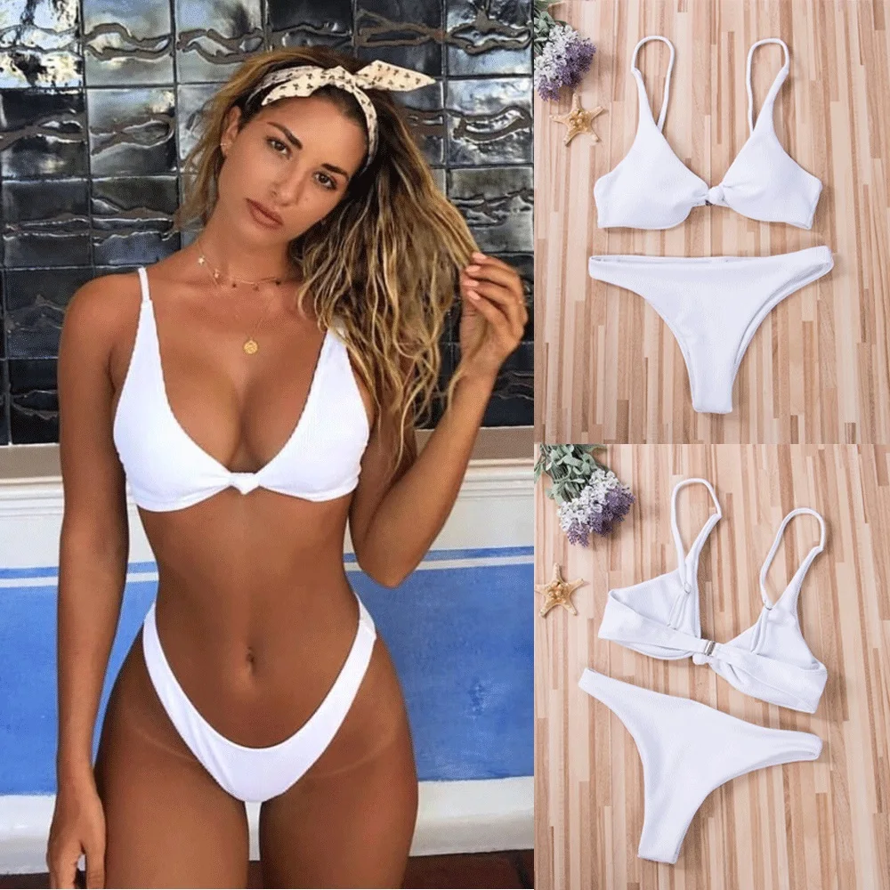 Для женщин пикантный однотонный бикини комплекты дамы недополненной Бюстгальтер Топы стринги, декорированные ремнем Купальники два-купал...