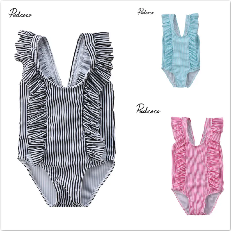 Летнее платье в полоску для маленьких девочек Цельный купальник пляжная одежда боди для девочек рюшами ванный комплект Полосатое цельнокр...