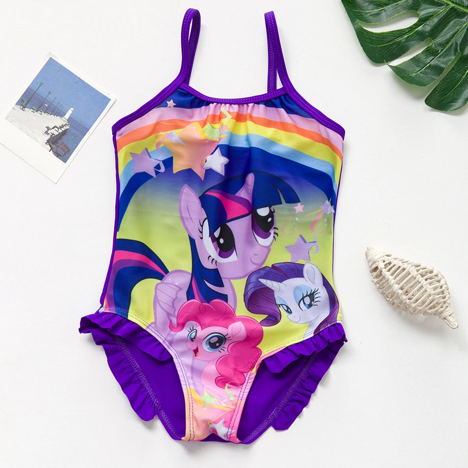 2019 слитный купальный костюм для девочек, фиолетовый купальный костюм с пони для детей, одежда для плавания, стильная пляжная одежда с оборка...