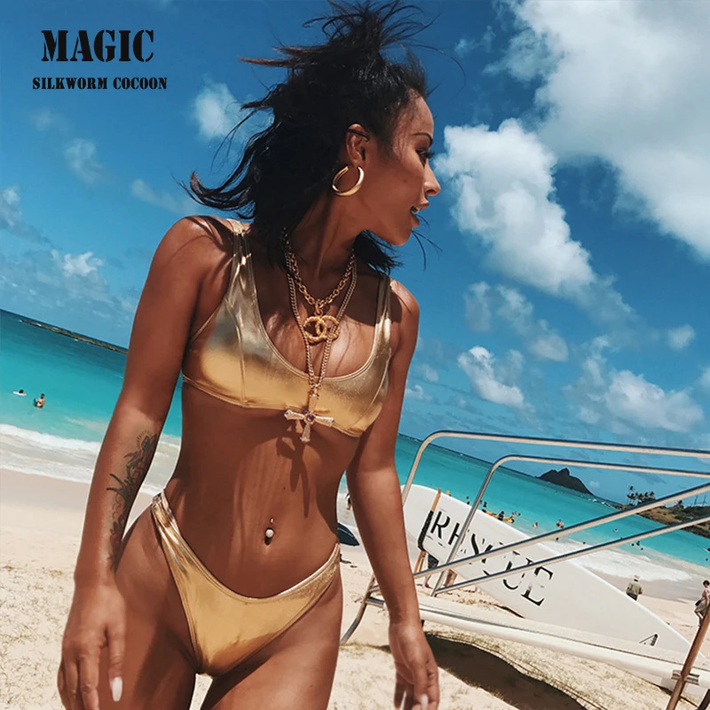 Одноцветное цвет золото Передняя Пряжка дизайнерские бикини комплект пикантные Высокая талия Купальник женская одежда заплыва костюм отп...