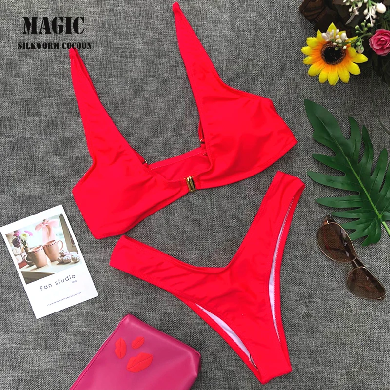 Новый бантом Высокая талия сплошной красный розовое бикини комплект для женщин купальник дамы ванный для Swimswear пляж одежда заплыва