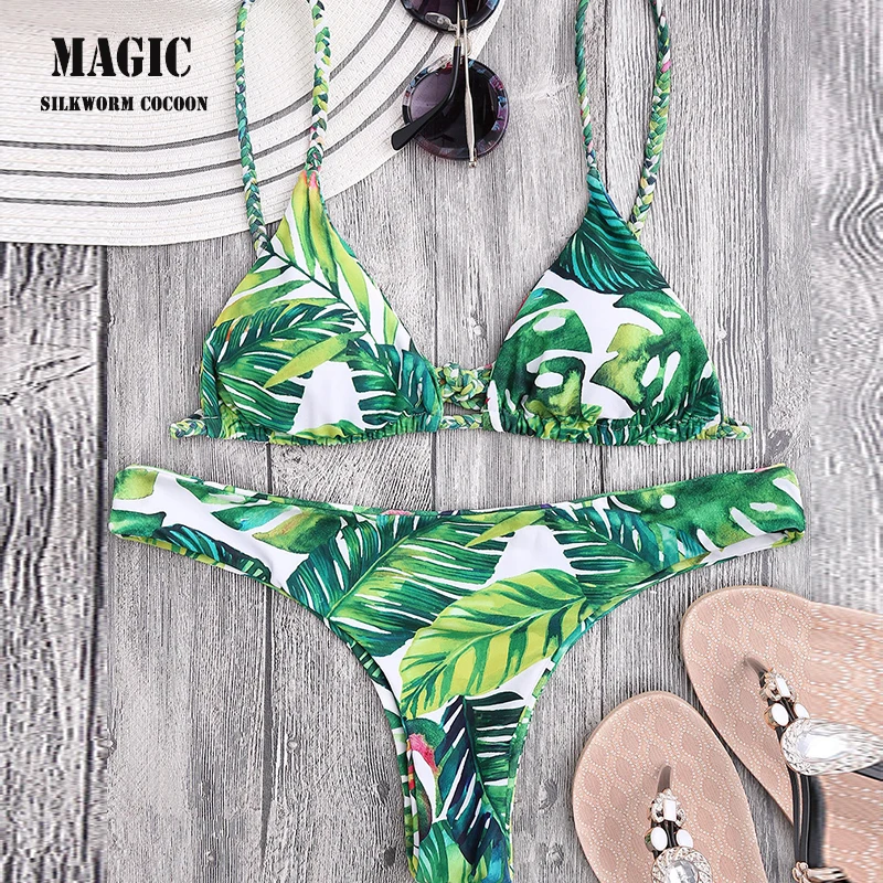 Зеленый лист двусторонний принт бикини набор женский сексуальный Плетеный ленточный перевязочный материал Купальники Maillot De Bain бикини, пля...