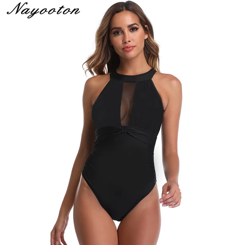 Сексуальный цельный купальник для женщин с высоким горлом марлевые печати Монокини черный купальник Женские Купальники костюм плюс размер...