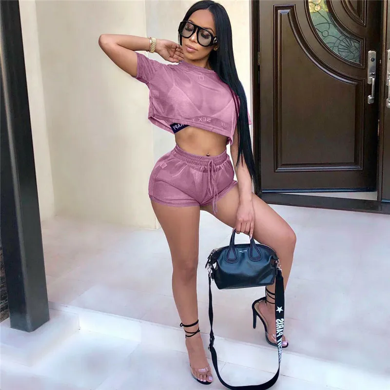 Женский комплект из 2 предметов, купальник, Сетчатое Прозрачное Бикини, элегантный укороченный топ и шорты, пляжный костюм, комплект из двух ...