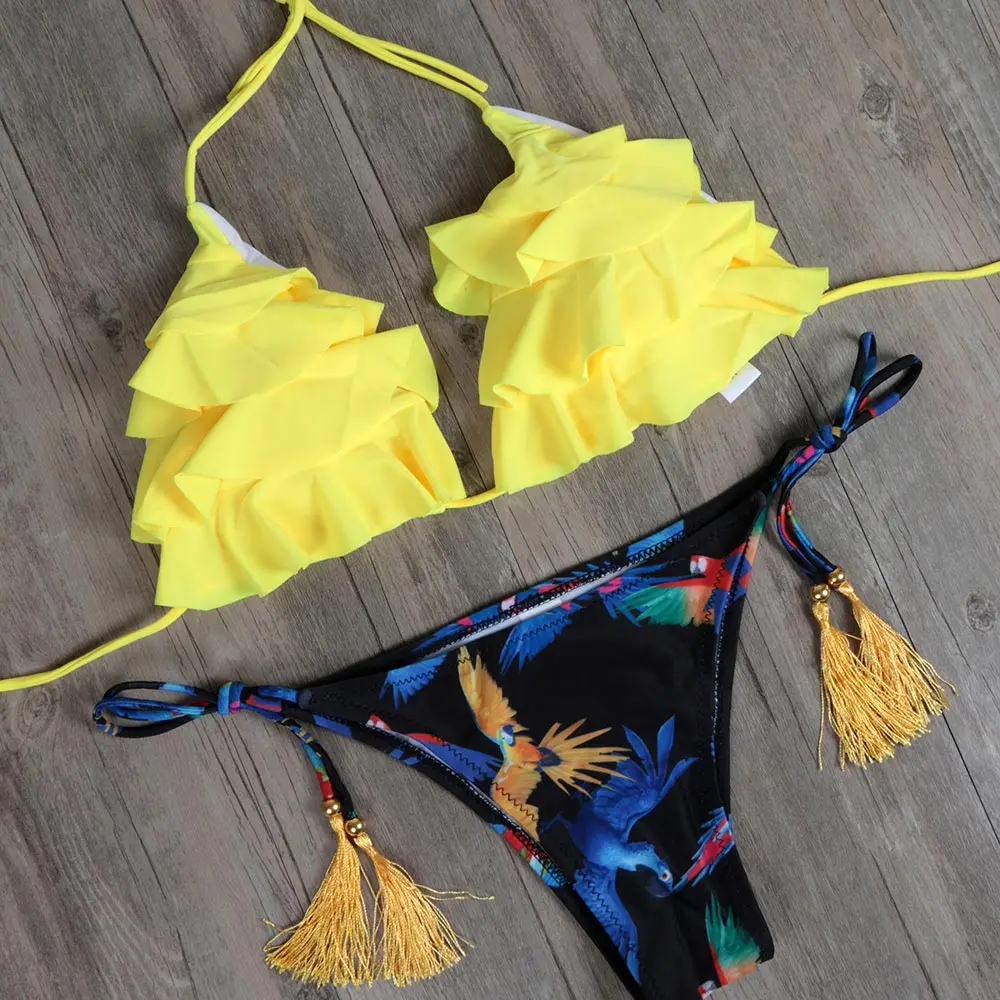 Biqueno Секрет купальный костюм для Для женщин бикини пляжная одежда желтый рюшами комплект бикини Купальники Холтер кисточкой бикини ванный ...