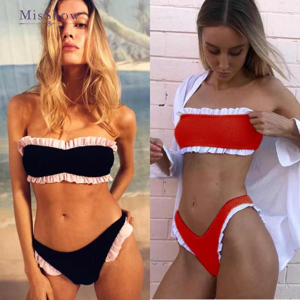 Яркий купальник бикини с рюшами женский купальник бикини бандо с высокой ножкой стринги бразильский комплект бикини женский купальный кос...