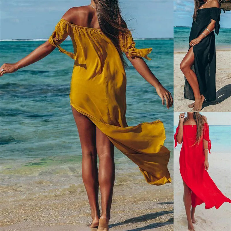 2019 Новая женская летняя пляжная одежда с открытыми плечами Длинные Макси платья горячий праздник купальник накидка платье сплошной цвет Са...