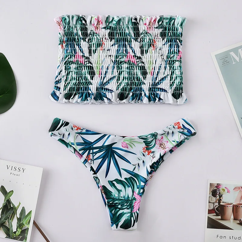 Бикини-бандо купальник с подсолнухом с принтом листьев, женский купальник, сексуальный купальный костюм с открытыми плечами, бикини без бре...