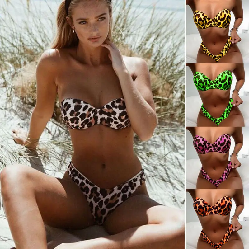 2020 летний женский леопардовый купальник, сексуальный комплект бикини, пуш-ап, без бретелек, бюстгальтер, стринги, купальный костюм, мини бик...