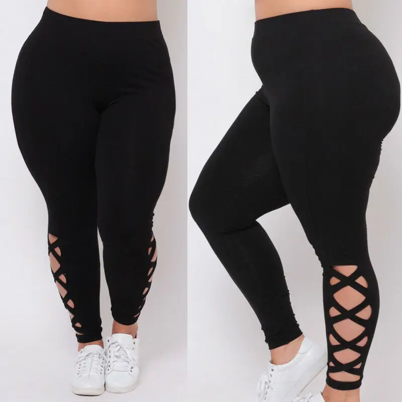 Женские эластичные леггинсы большого размера для спортзала, однотонное ажурное, с перекрестными лямками, спортивные штаны, черные, для фитн...