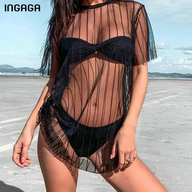 INGAGA, однотонная пляжная одежда, накидка, прозрачная сетка, длинное пляжное платье, короткий рукав, купальник для женщин, 2020, полосатый купаль...