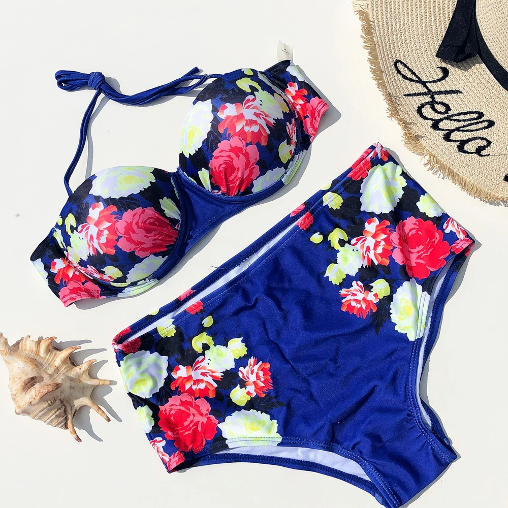 Цветочный принт пальмовое дерево комплект бикини, высокая талия купальники, высокая шея майка молния полосатый купальник Мягкий Бюстгальт...