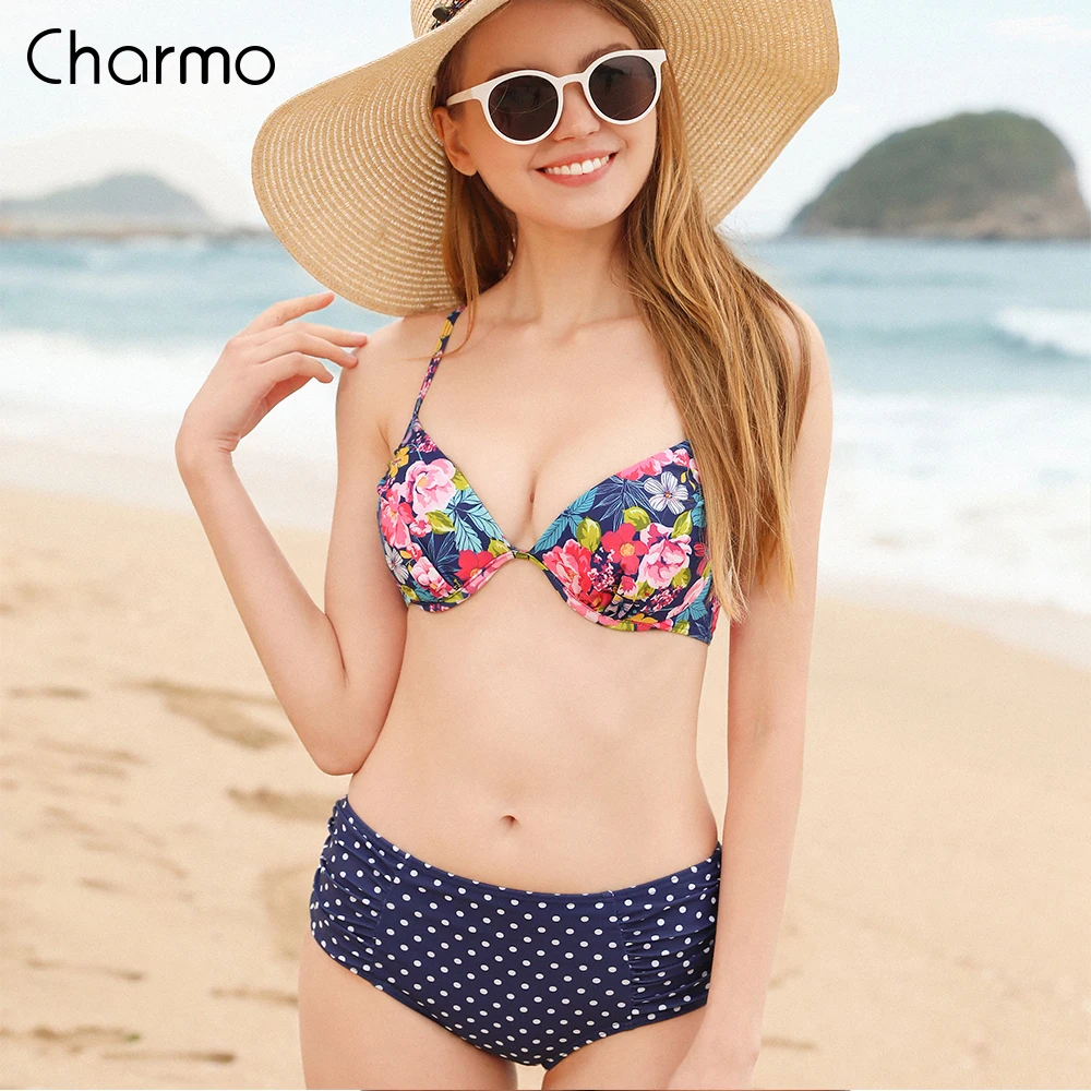 Charmo бикини женский купальник сексуальный плавательный костюм платье в горошек с цветочным принтом купальный костюм Backcross пуш-ап бандажный ...