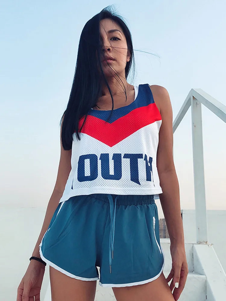 Фитнес укороченный Топ для женщин без рукавов Лазерная перфорированная вентиляция укороченный Топ жилет Йога Рубашка Синий Красный v-образ...