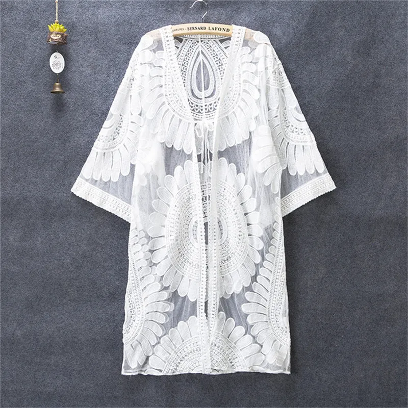2018 вышитый белый Купальник Cover Up прозрачная Кружево Бикини Cover Up Для женщин De Plage пляж кардиган ванный комплект крышка до