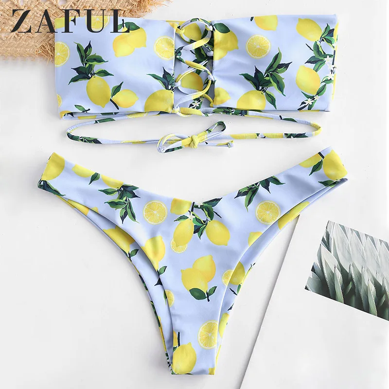 Zaful лимонный Принт без бретелек Мягкий бикини на шнуровке бандо Бикини Набор для женщин лимонный принт на шнуровке бандо Бикини Набор 2020