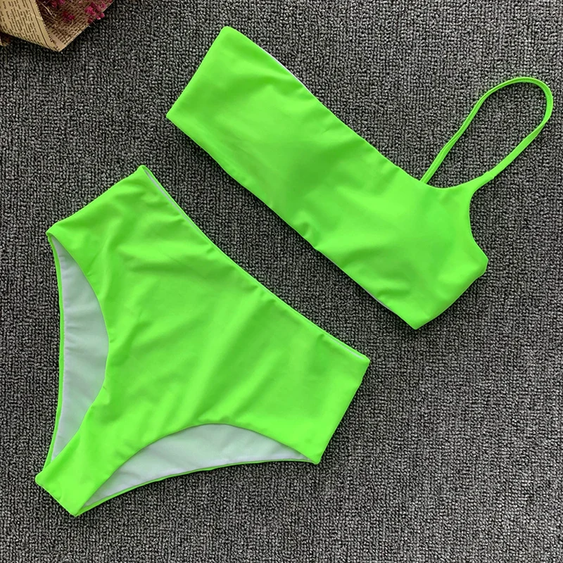 Бикини с высокой талией, 2020, два куска, купальник, сексуальный, бандо, неоновый, на одно плечо, танкини, купальник для женщин, купальник для же...