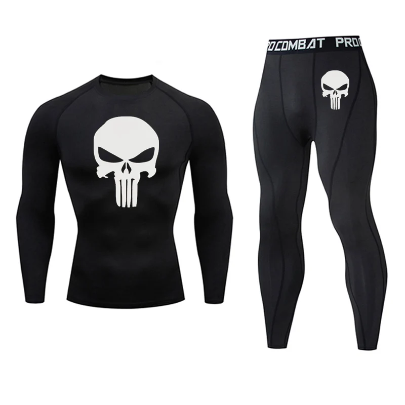 Мужская спортивная одежда, Компрессионные Леггинсы для спортзала, футболка с черепом, теплый базовый слой, зимний спортивный костюм из 2 предметов, мужской комплект для бега
